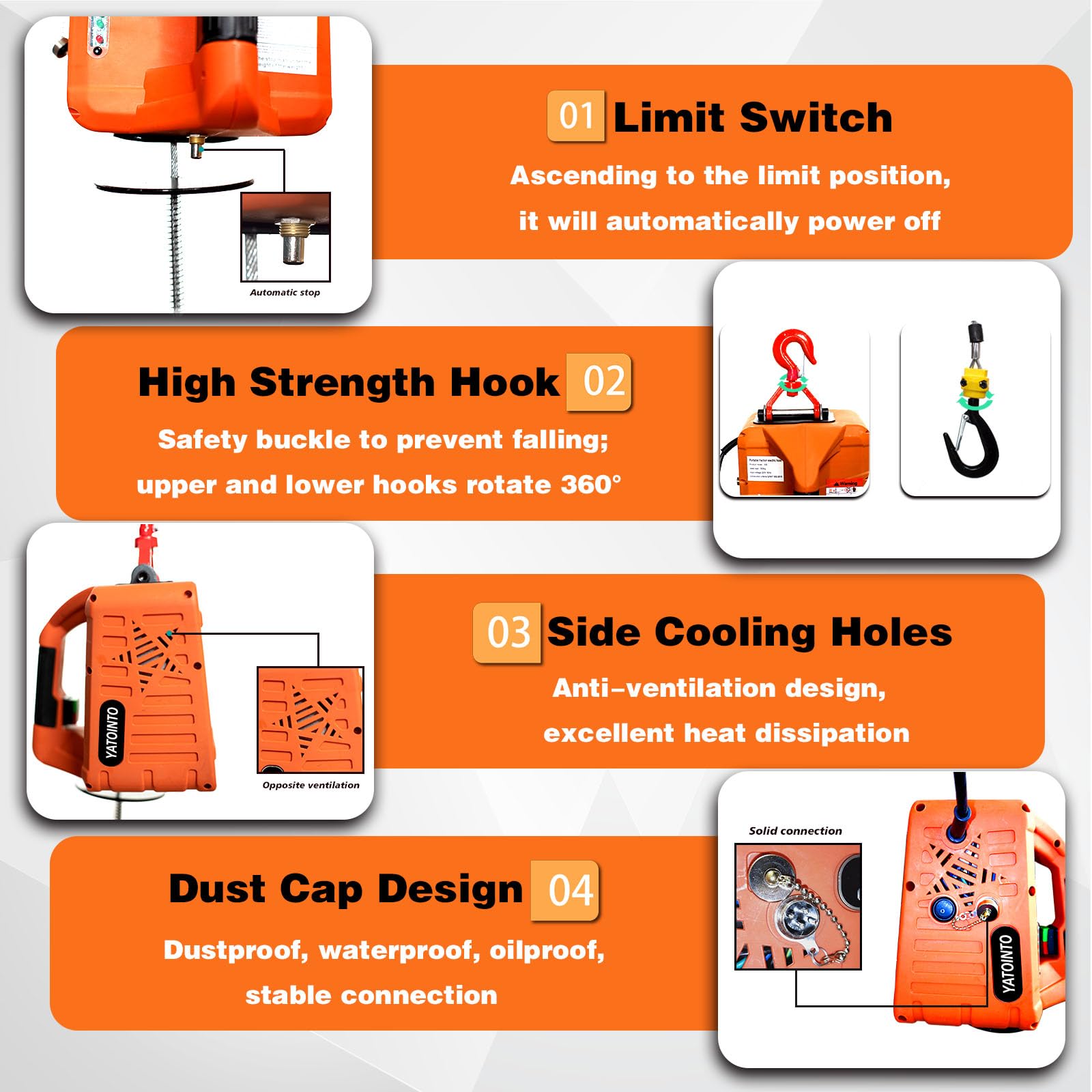 🔶High Safety Performance: ◼️ Safety limit device: Triggering the safety limit device will automatically cut off the power supply ◼️ Crane falls and thickens: strong bearing capacity ◼️ Alloy forging hook: 360° rotation, safety buckle design ◼️ Overload protectio