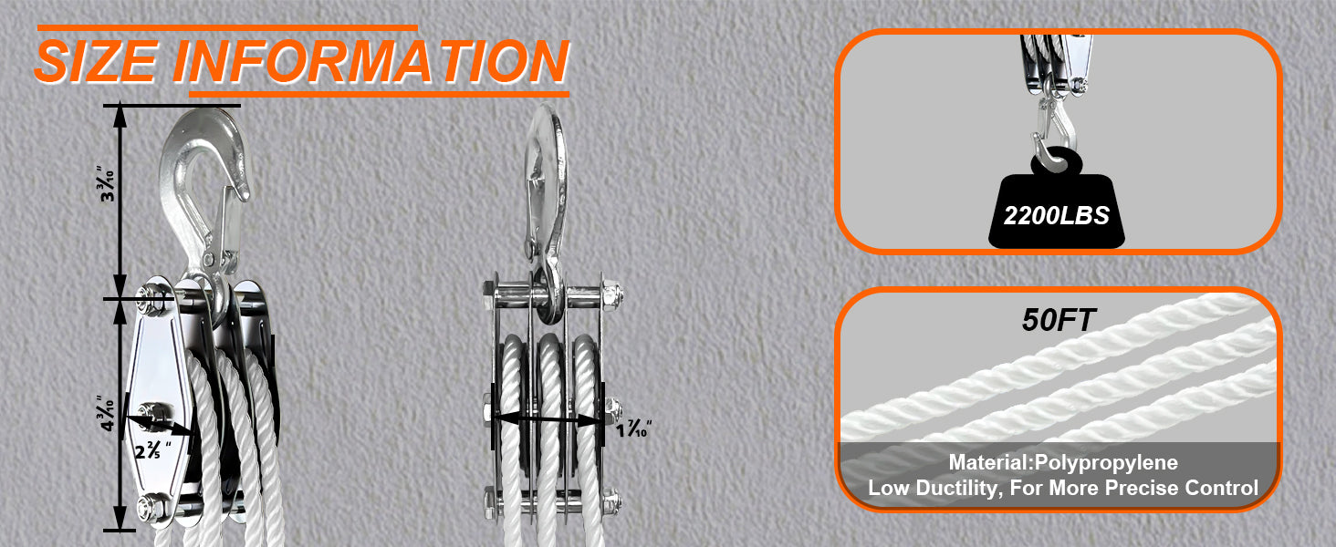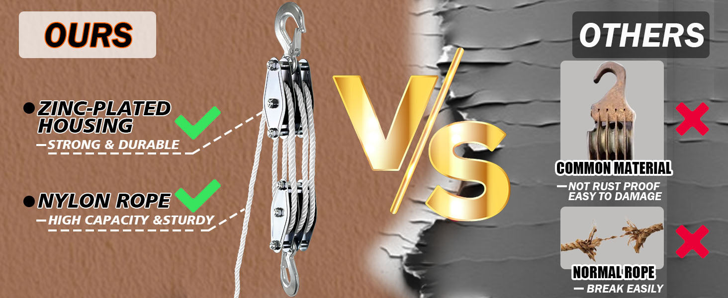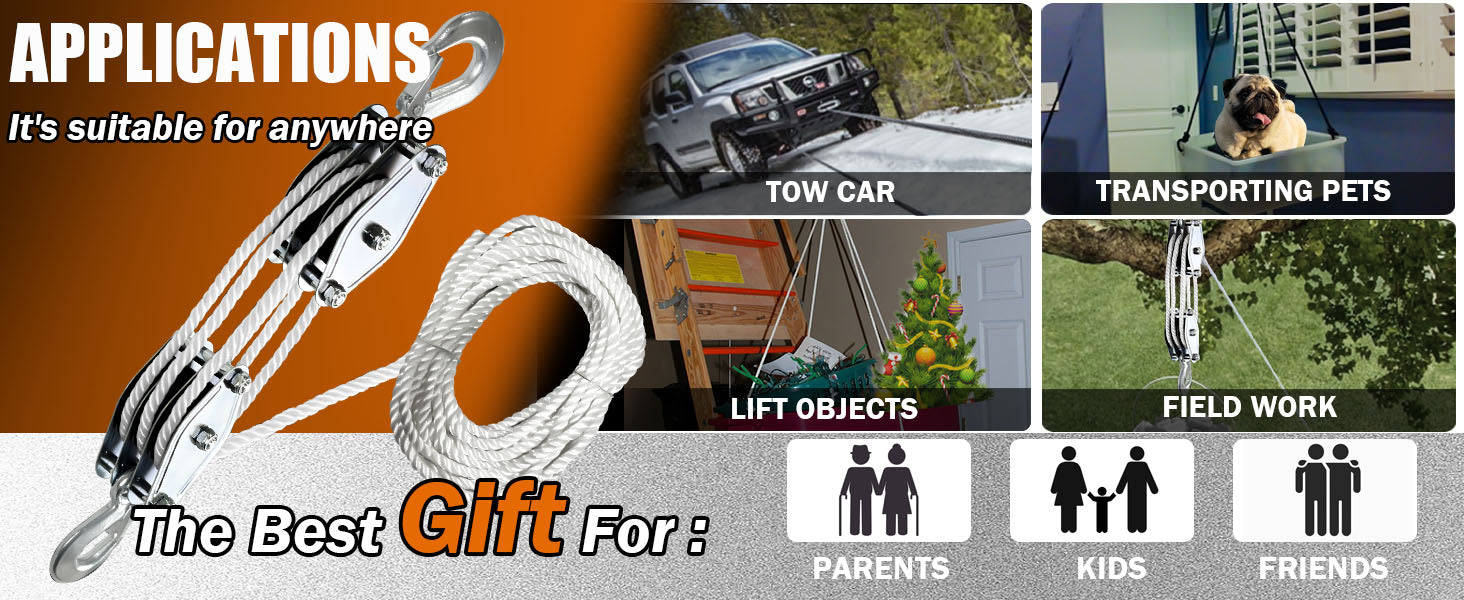 【HEAVY LOAD CAPACITY】: With 2200LBS Breaking Strength and 1100LBS Load Cap block and tackle pulley system, this heavy-duty pulley will lift both heavy and light stuff.