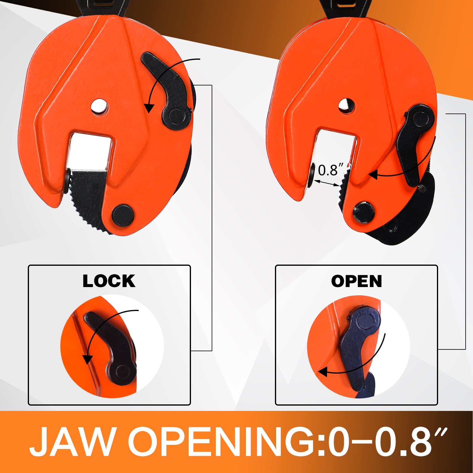 【 0.8T CAPACITY 】-- Lifting clamps, capacity 0.8T, Jaw opening up to 0.6'', Large diameter of sheet metal clamp can bear a variety of thickness of steel plate
