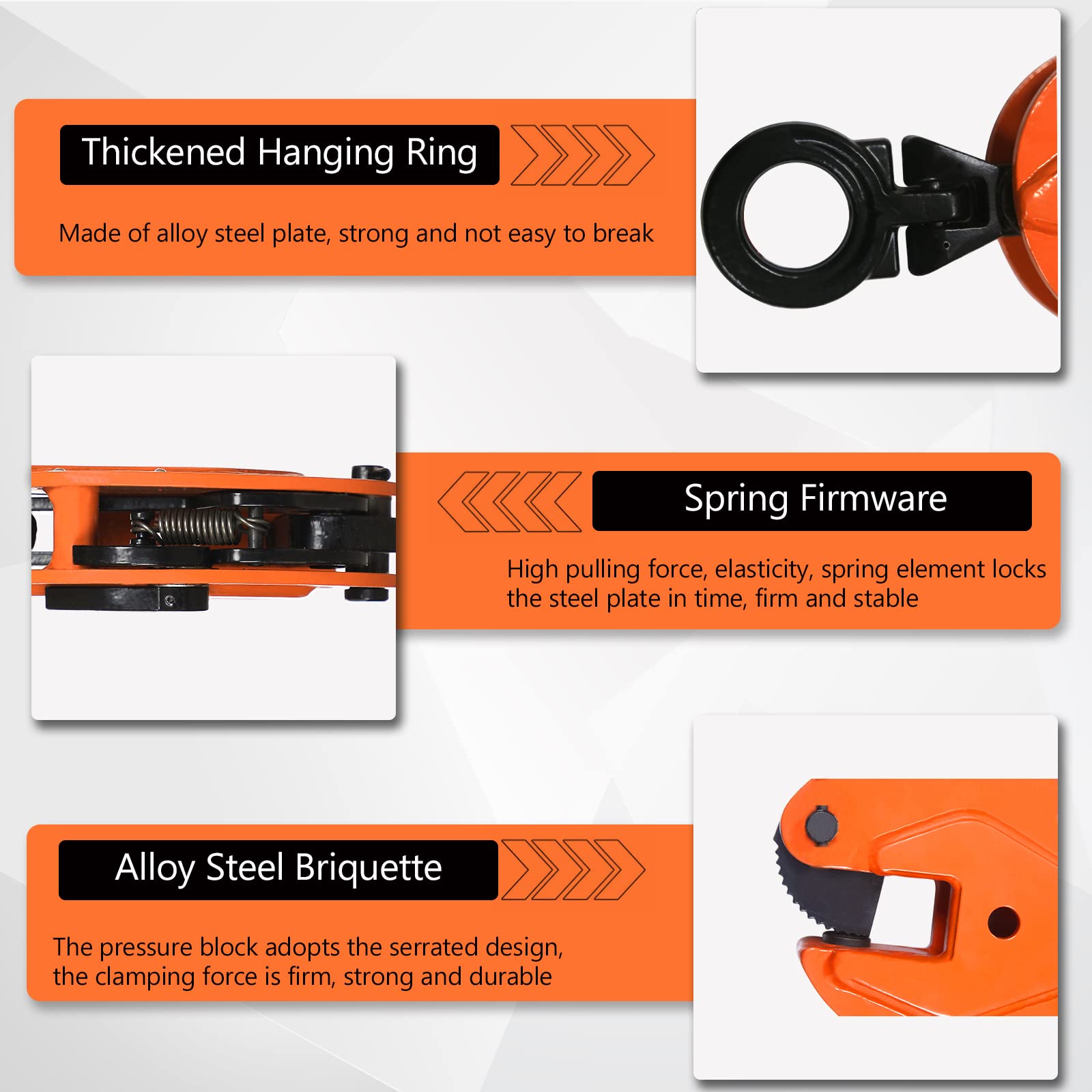 【 SAFETY MACHANISM 】-- The steel plate hoist of vertical clamps has a self-locking device, ensuring clamps doesn't slip. Clamping speed, high efficiency.