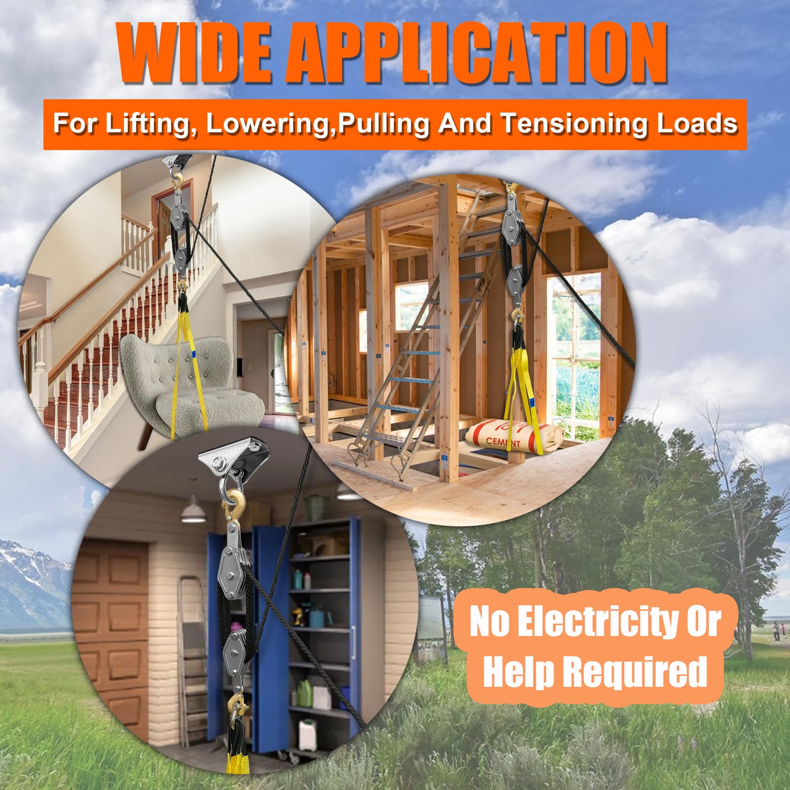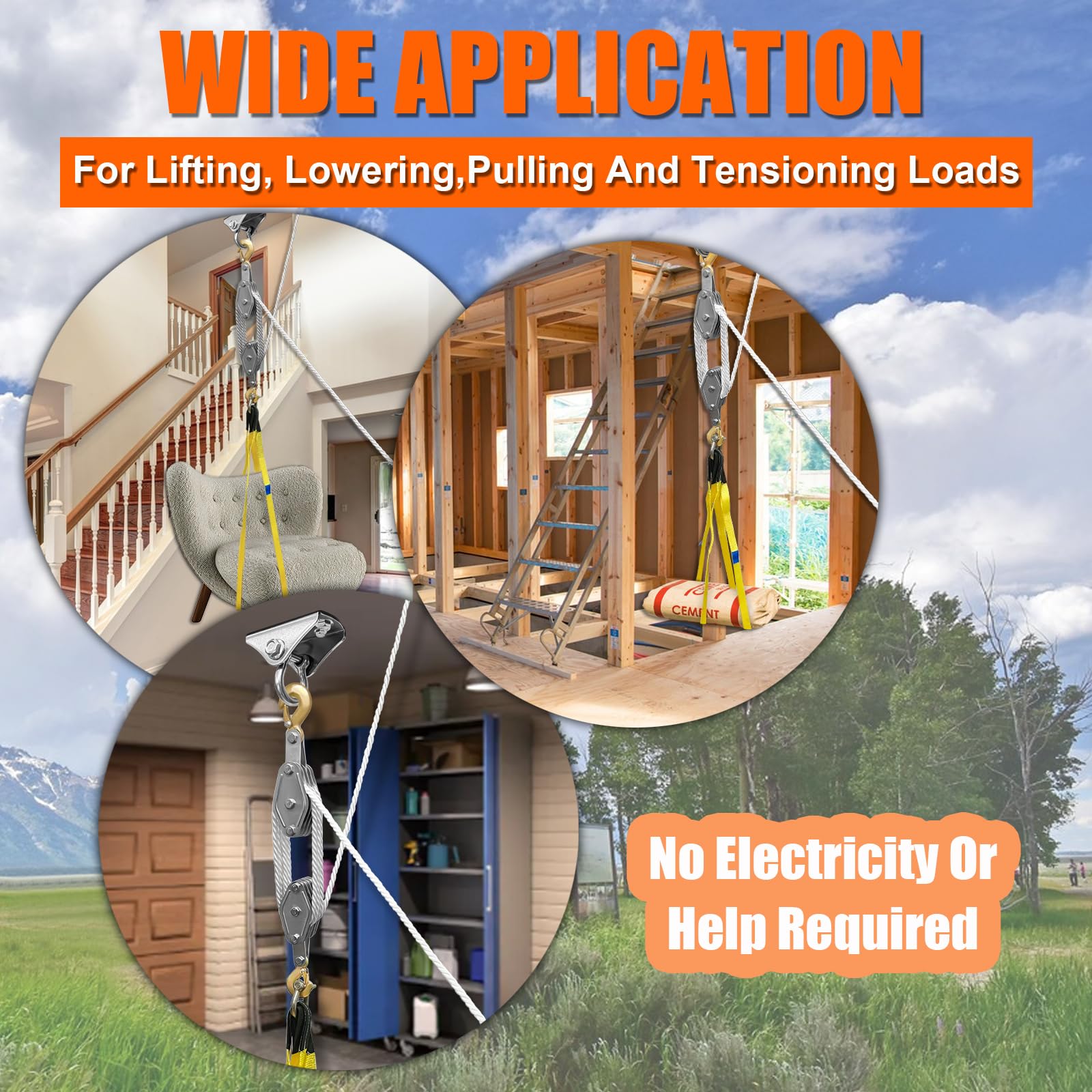 【Improves Lifting Convenience】:The block and tackle pulley system with 8:1 lifting power can minimize the work you have to put in when lifting, allowing you to lift heavier stuff;You can do all the works with the pulley system without electricity or help.
