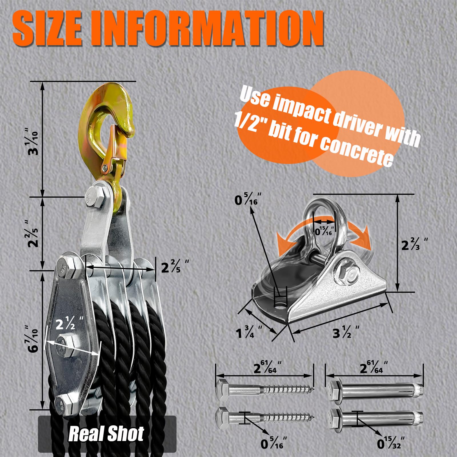 Rope Hoist Pulley System, 4400LB Block and Tackle Pulley System, 8:1 Lifting Power 3/8 × 65ft, Pulley Block for Lifting Loading Pulling with 1 Swing Hanger 2 Screws 2 Expansion Bolts