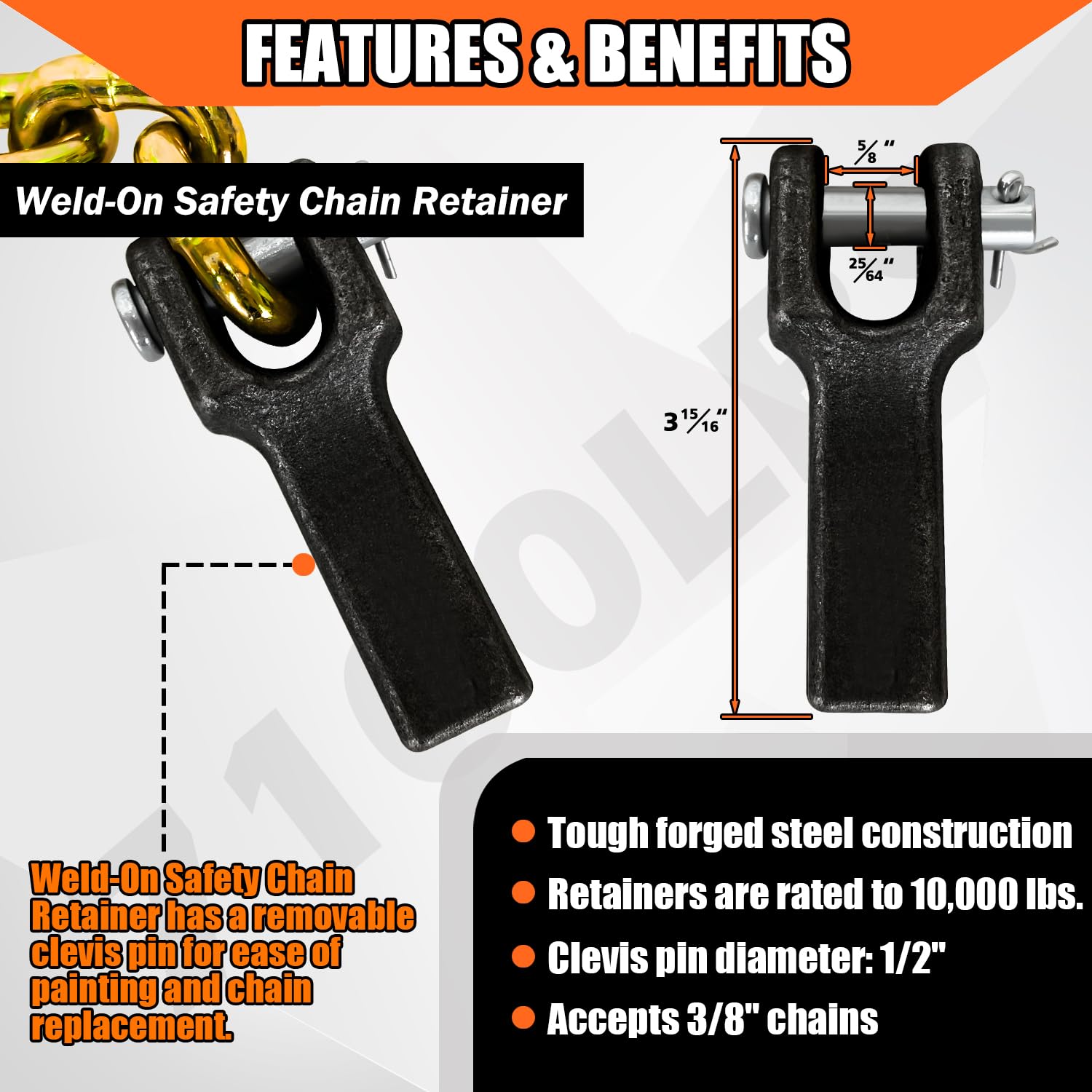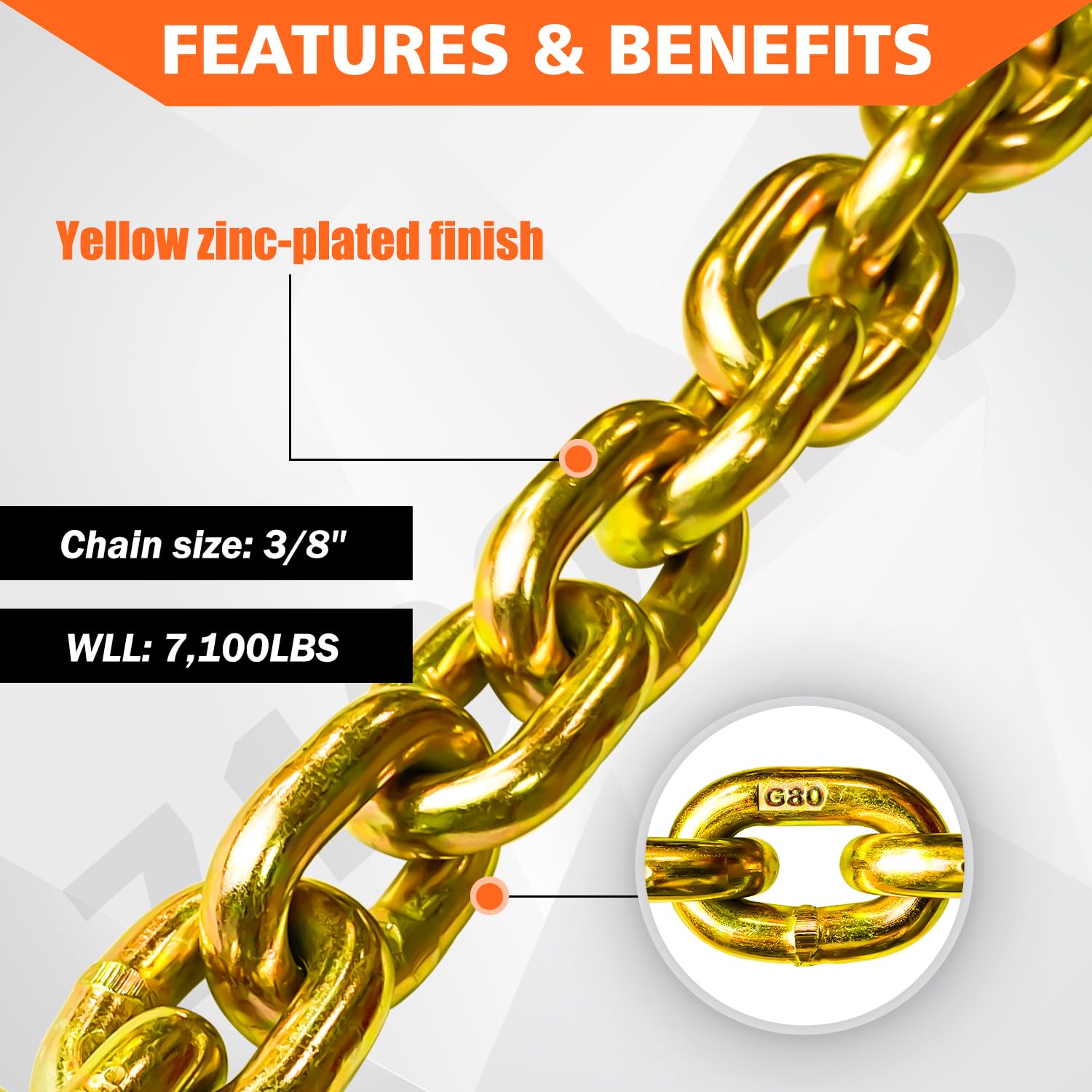 👍[ HEAVY DUTY CONSTRUCTION ] -- The high quality, standard link 3/8" size chain is heat-treated, and strength tested for superior quality. The chain retainer has a removable zinc-plated pin and cotter for easy chain installation and replacement.