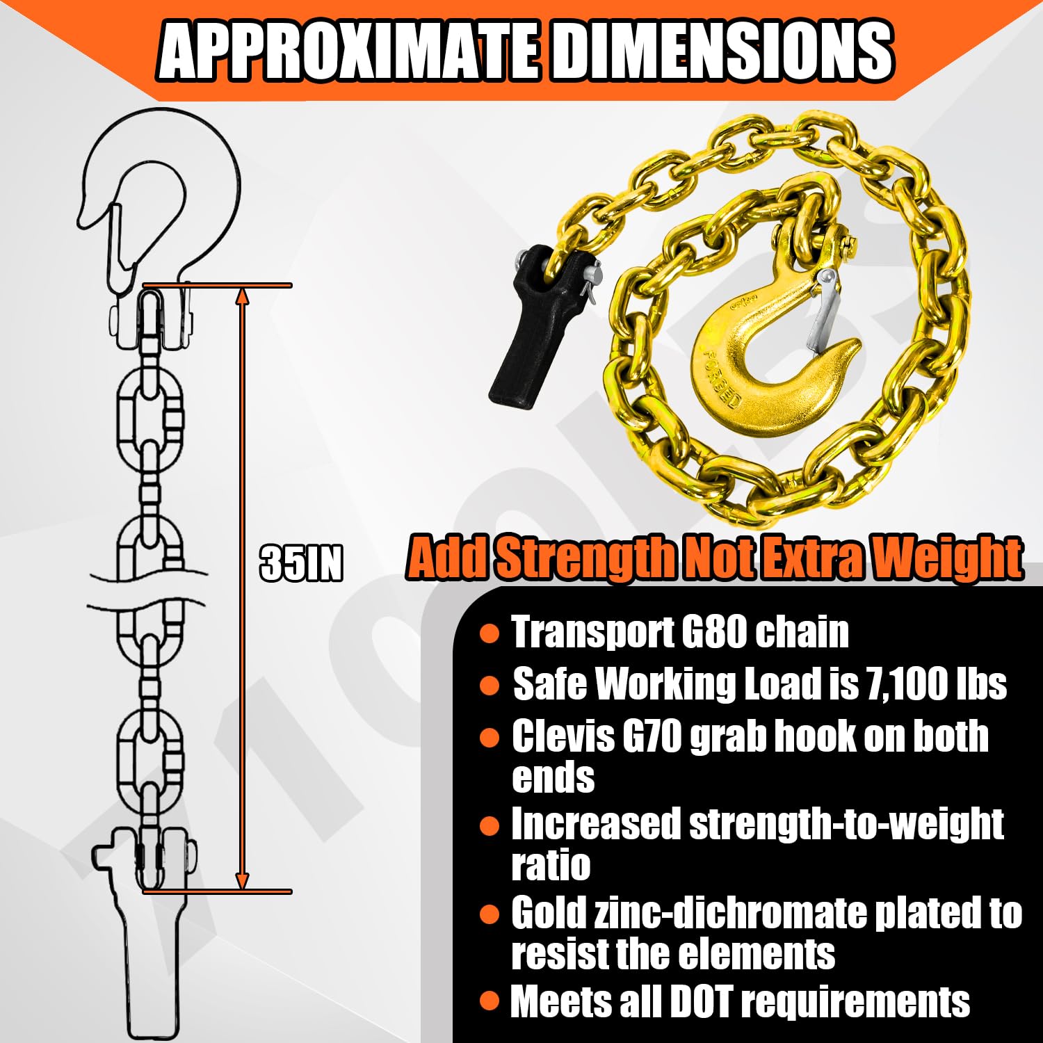 2-Pack Grade 80 Trailer Safety Chain 35 Inch with 3/8'' Clevis Snap Hook and Chain Retainer | Transport Chain WLL 25,000 lbs for Towing