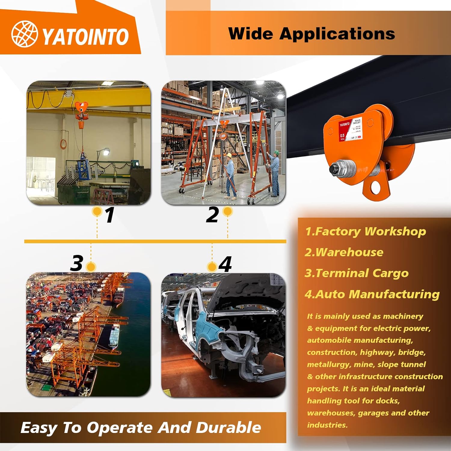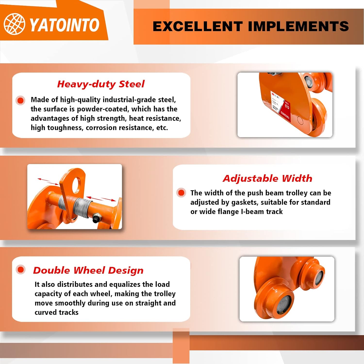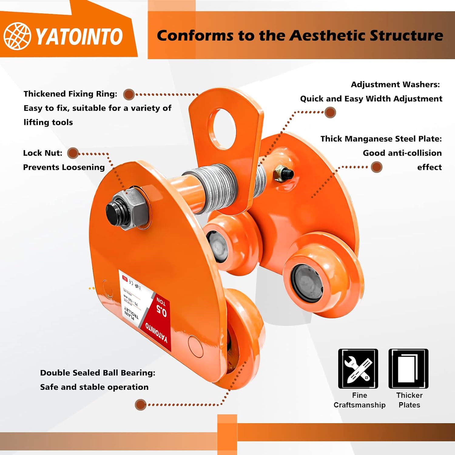 [Super Loading Capacity] -Designed for manual horizontal transport, the beam trolley allows large manual or electric lifting equipment to easily slide horizontally back and forth, preventing unnecessary wear and tear on the track.