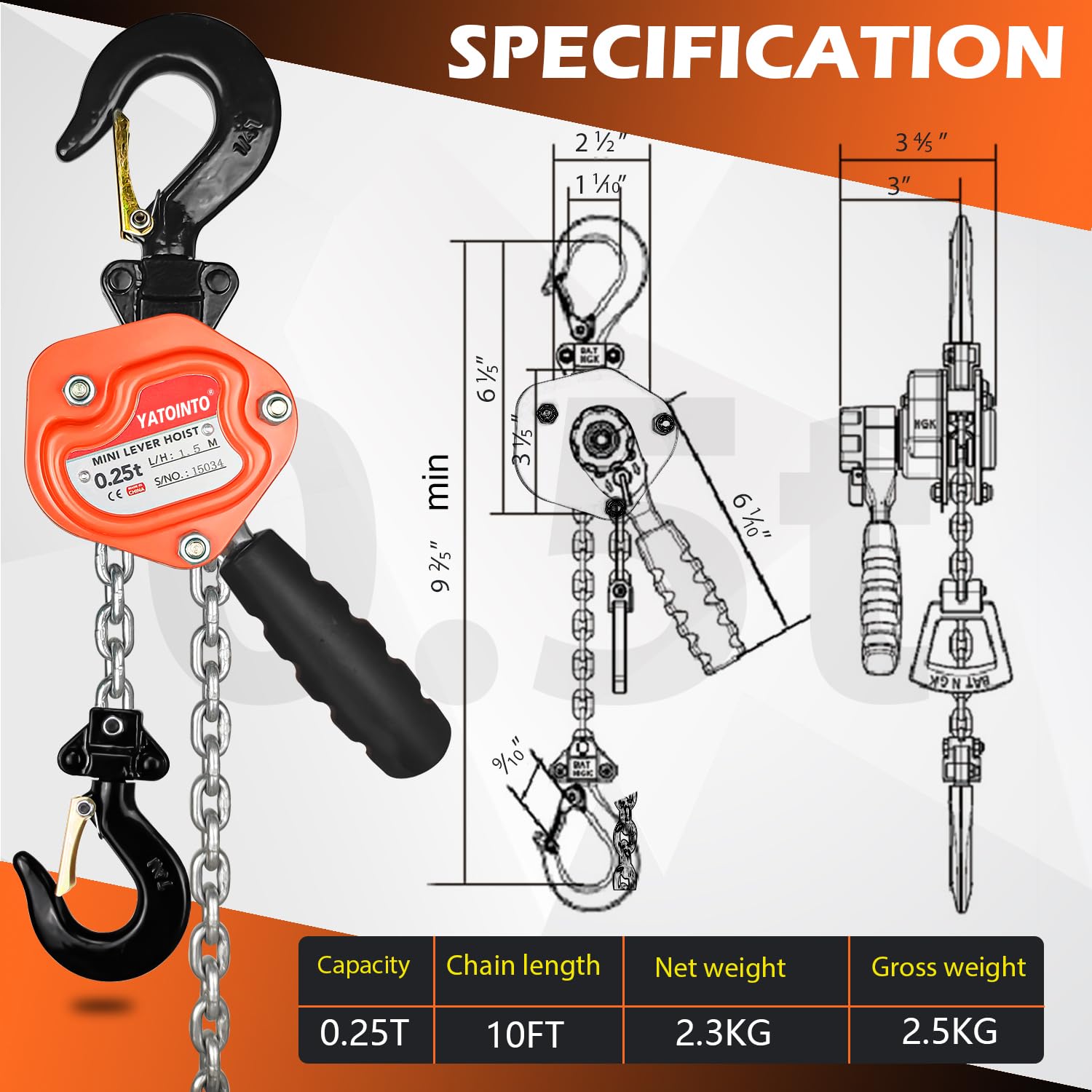 YATOINTO Lever Block 1/4 Ton 550lbs Mini Lever Block 3M 10Ft Chain Hoist Manual Lever Hoist Chain Hoist Alloy Steel G80 Chain Ratchet Lever Hoist with Hook