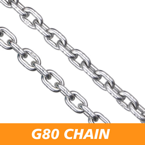 These chains are made of premium G80 alloy steel with electro-galvanized coating for extra durability and resistance against corrosion and grime.