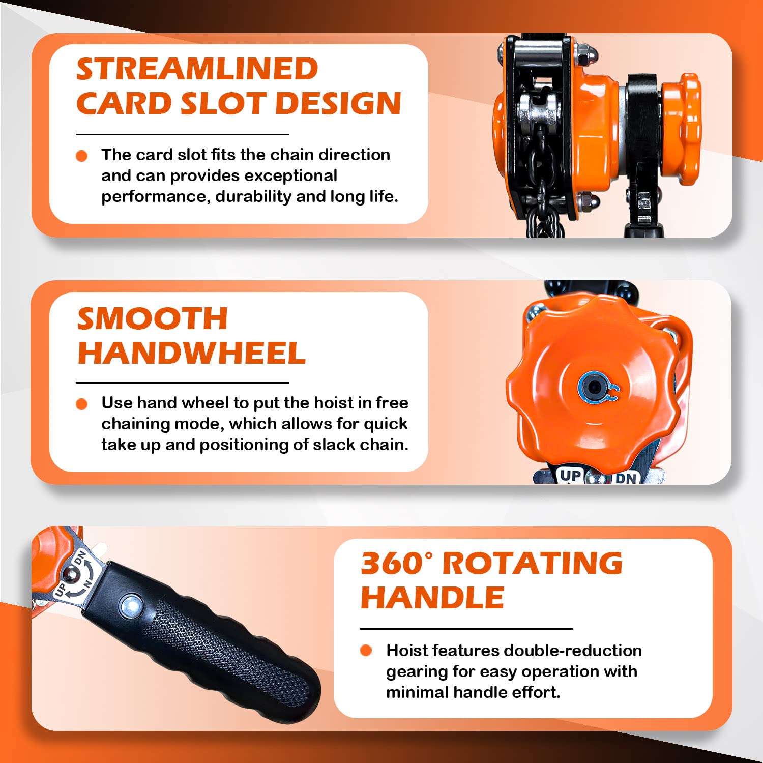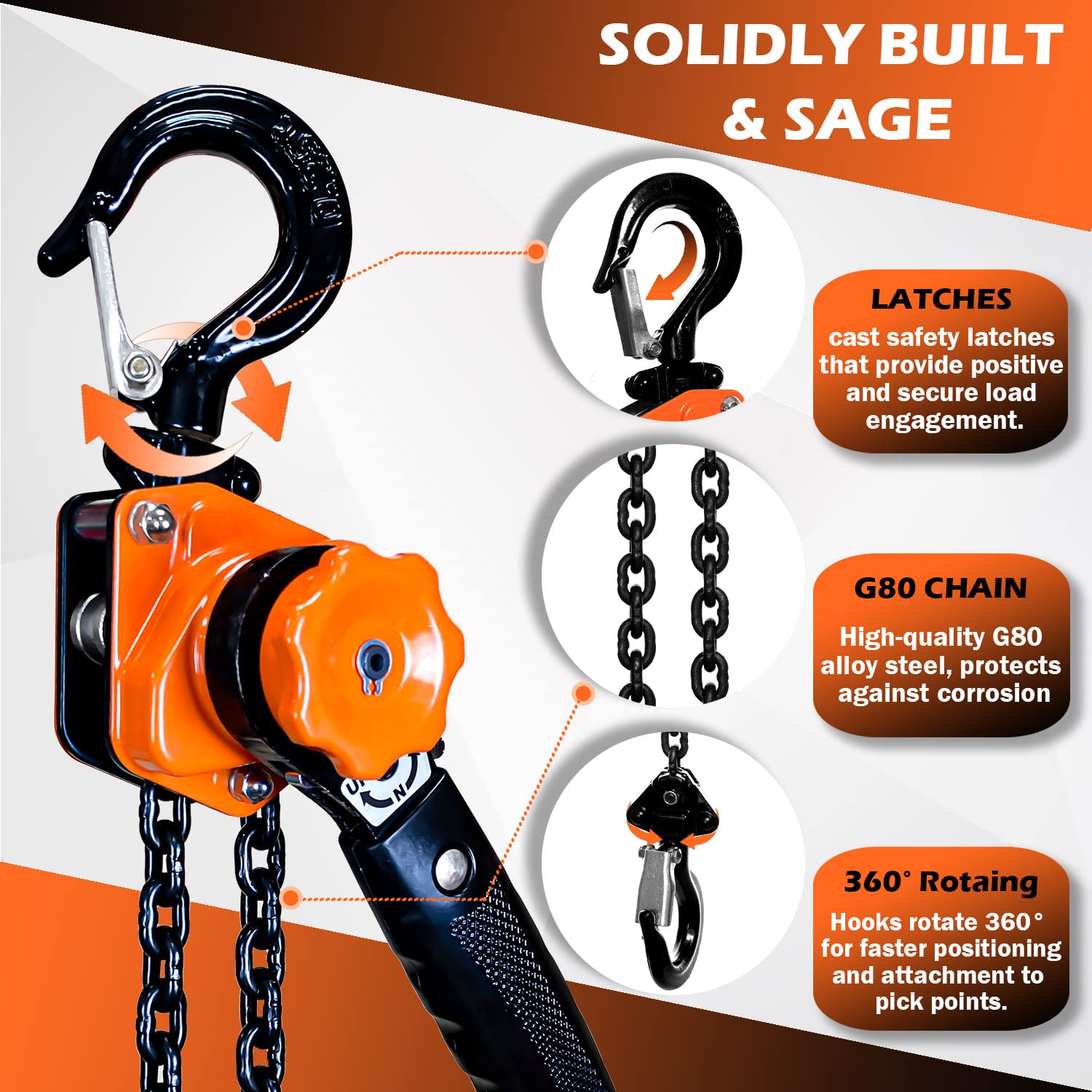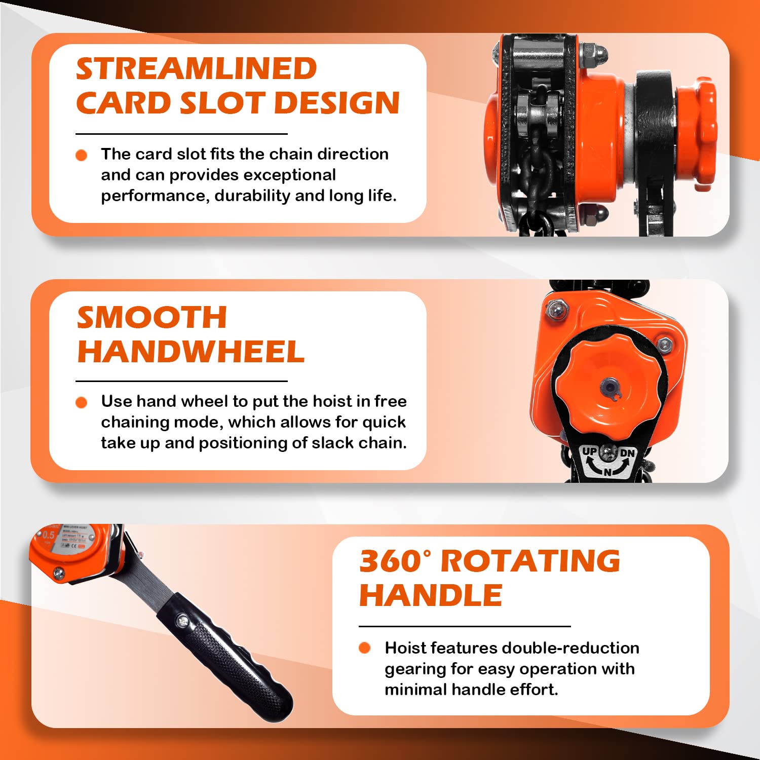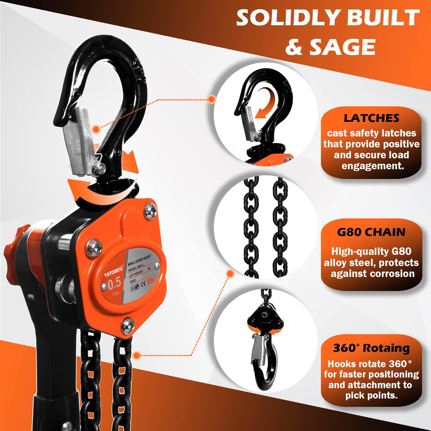 ⚙️【 HUMANIZED DESIGN 】-- With a safety latch to prevent falling off, the rubber anti-skid pad on the handle, and the chain hoist can help you reduce risks and keep you in a safe working environment.