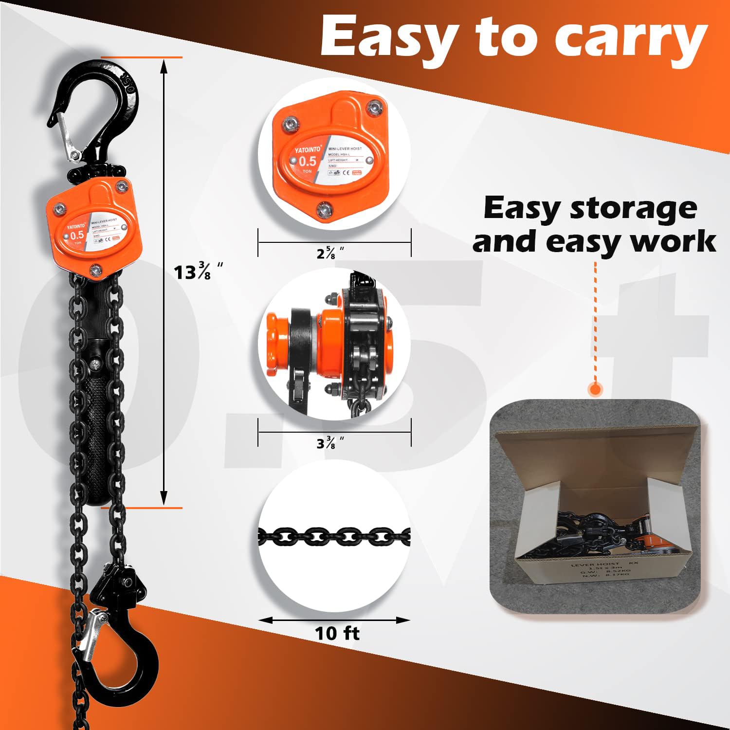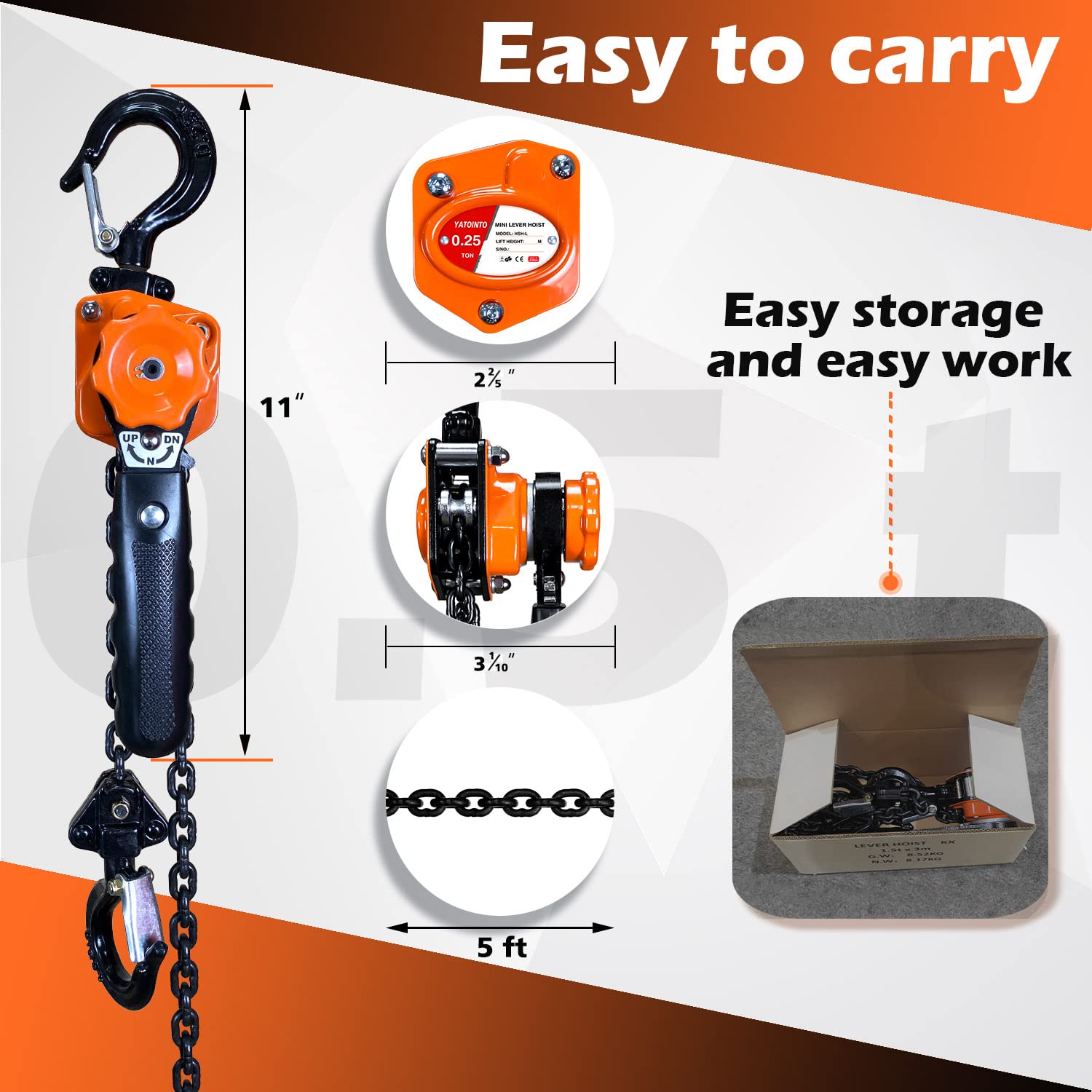 ⚙️ 【 LARGE LOAD CAPACITY 】-- Mini lever chain hoist with a lifting capacity of 1/4 Ton and a length of 10ft, the chain has enough tension and strength to load heavy objects.