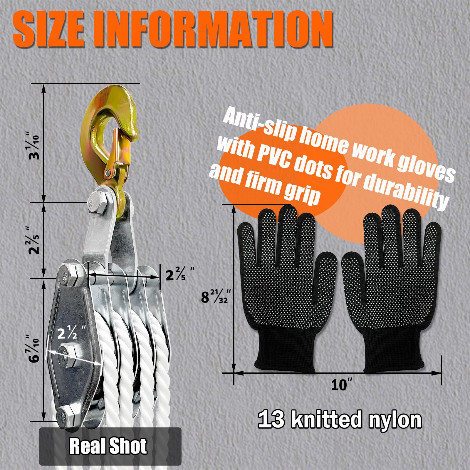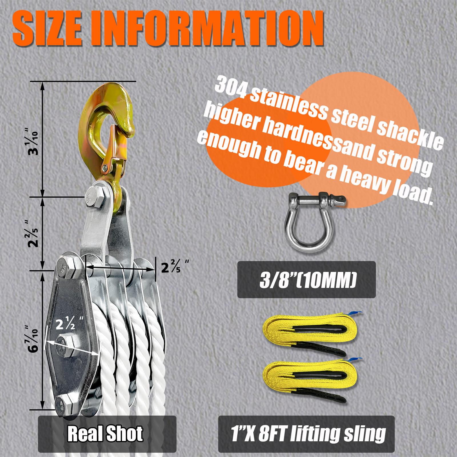 【IMPROVES LIFTING CONVENIENCE】:The block and hoist system with 8:1 ratio lifting power can minimize the work you have to put in when lifting, allowing you to lift heavier stuff; While you can do all the works with the pulley block and tackle without electricity or help.