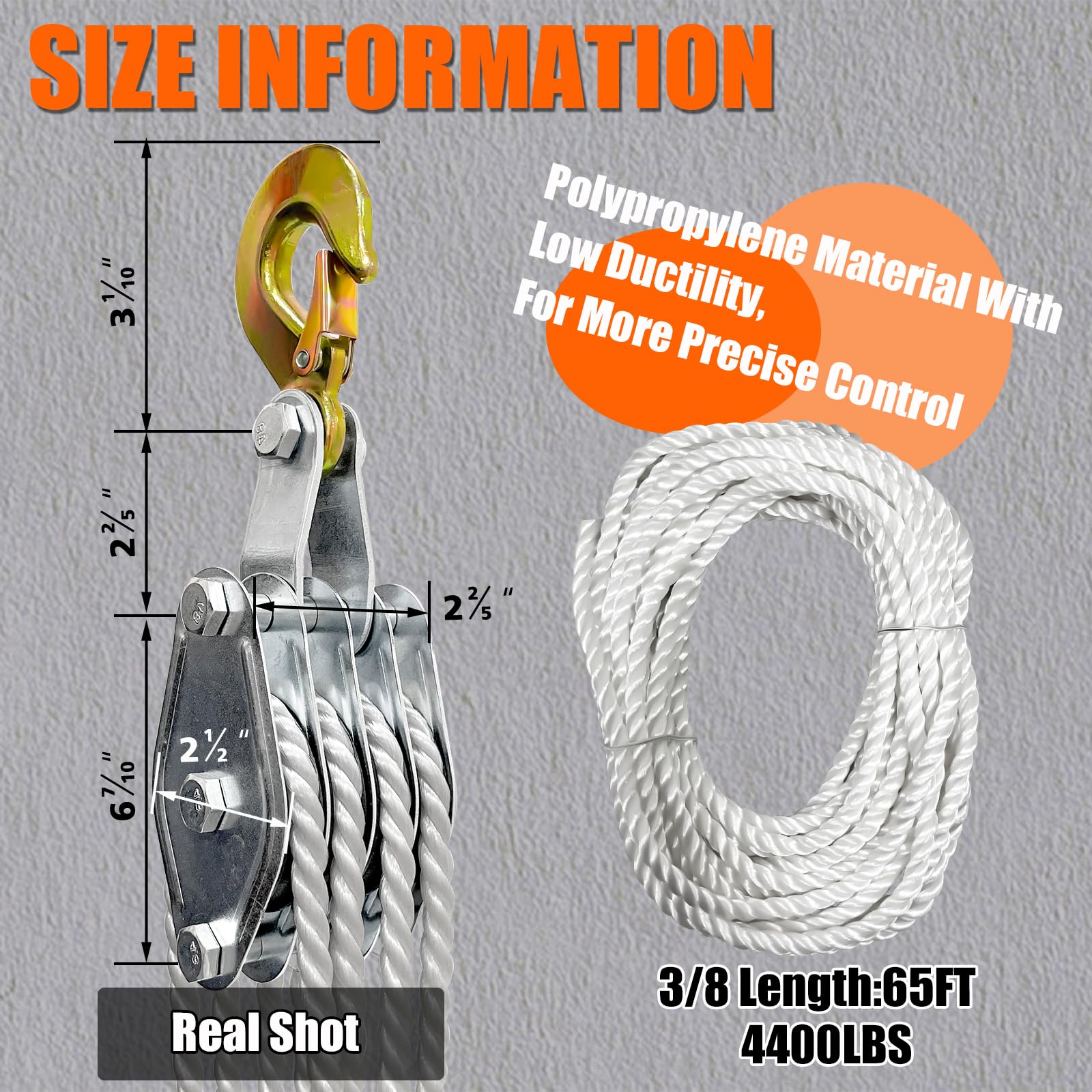 YATOINTO Rope Hoist Pulley System, 4400LB Pulley Block and Tackle, 8:1 Ratio Lifting Power 3/8 × 65ft, Heavy Duty Pulley Block for Hunting Lifting Heavy Objects Garage Warehouses Building