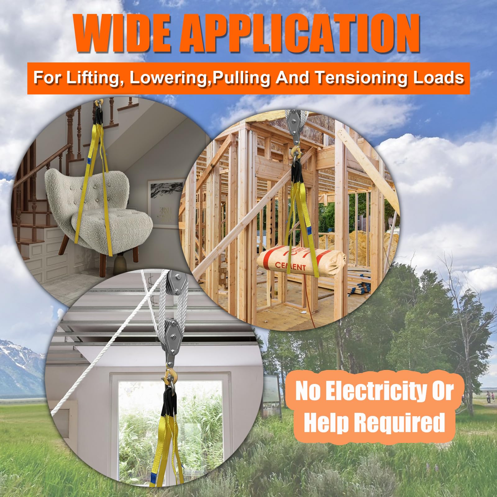 【HEAVY LOAD CAPACITY】: 4400 lbs Breaking Strength and 1100 lbs Load Cap pulley block and tackle system, this heavy-duty hoist will lift both heavy and light stuff; No worrying about damage due to excessive load.