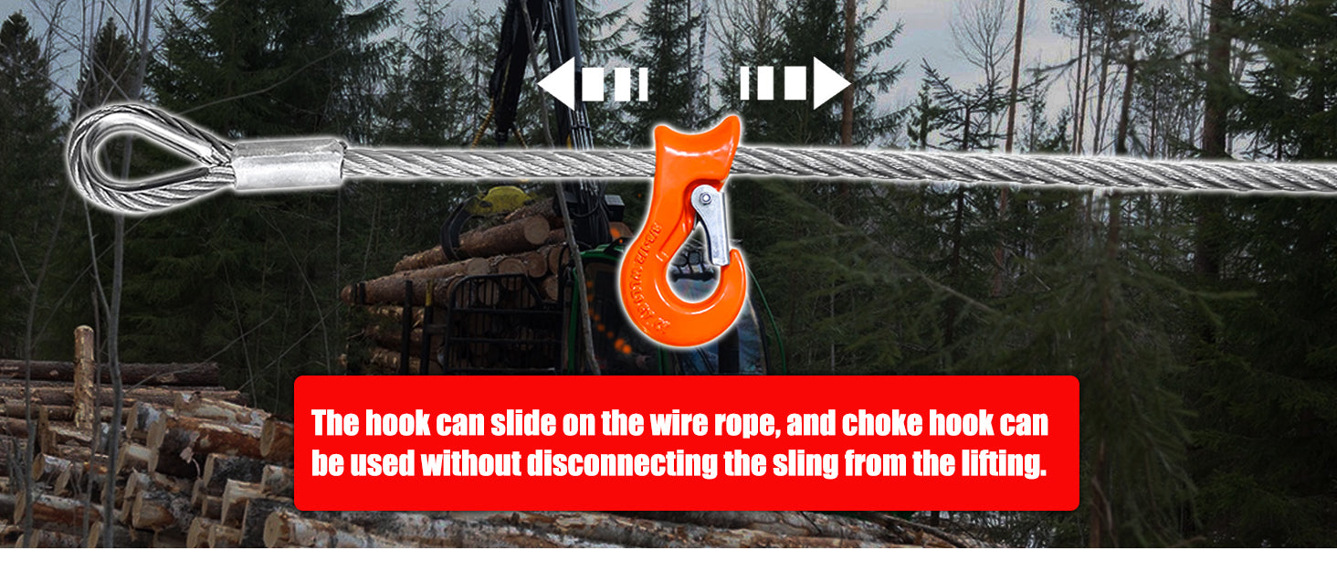 【Sliding Choker Design】: The hook can slide on the wire rope, and choke hook can be used without disconnecting the sling from the lifting.